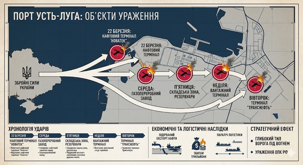 У березні 2026 року стратегічний російський порт Усть-Луга на Балтійському морі опинився під серією безпрецедентних атак. Головний експортний хаб країни-агресора, який роками забезпечував значну частину валютних надходжень і підтримував воєнну економіку, фактично перетворився на зону постійної небезпеки.