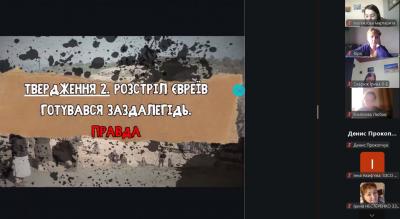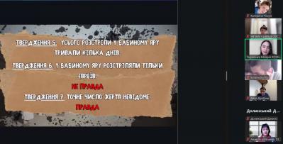 Разом із співробітницею соціокультурного відділу бібліотеки Валерією Тараненко учасники говорили не лише про важливість збереження історичної пам’яті, формування гуманістичних цінностей та виховання гідності через освіту, а й про спроби спотворення історії Бабиного Яру. Підіймалися теми поширених міфів і замовчувань, які десятиліттями намагалися перекрутити правду про цю трагедію.