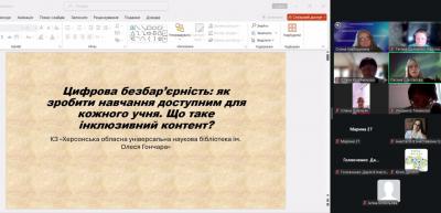 В епоху розвитку цифрових технологій питання цифрової безбар’єрності набуває все більшої актуальності. Як створювати інклюзивний контент, який буде зрозумілим для кожного користувача? Що таке універсальний дизайн? І що потрібно враховувати при розробці інформаційних продуктів? Про це, і не тільки, говорили під час вебінару «Цифрова безбар’єрність: як зробити навчання доступним для кожного учня. Що таке інклюзивний контент?». Захід провели для освітян – слухачів КУ «Центр професійного розвитку педагогічних працівників» ХМР – фахівці нашої бібліотеки Тетяна Донченко та Оксана Шестакова.